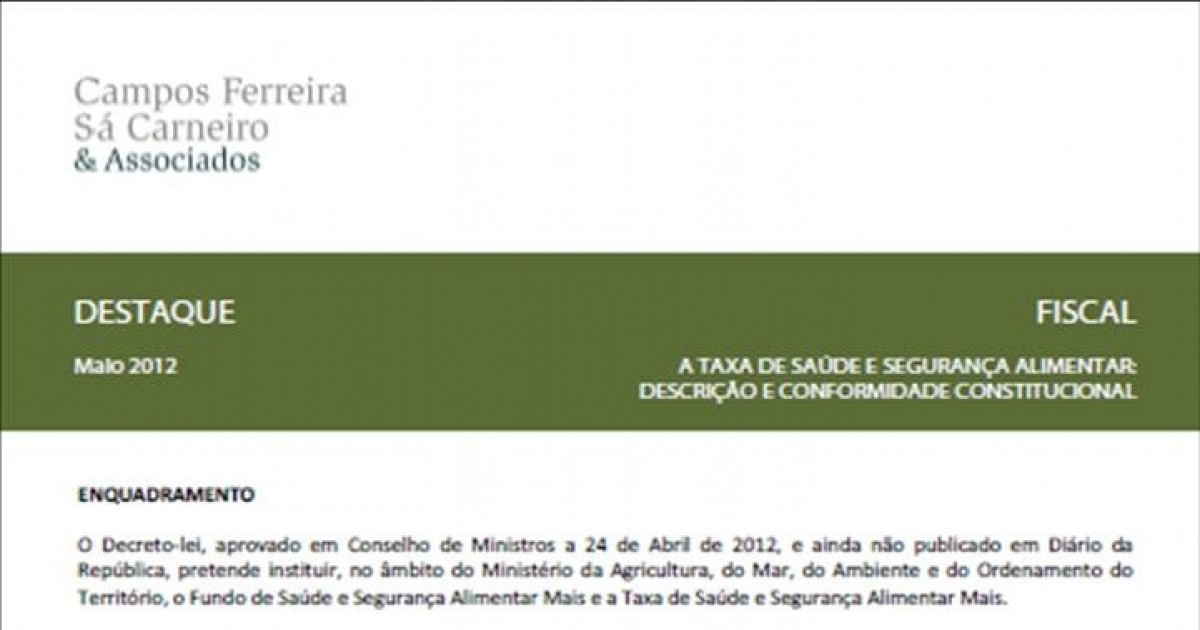 O Conselho de Ministros aprovou um Decreto-Lei, ainda não publicado em Diário da República, que cria o Fundo de Saúde e Segurança Alimentar Mais e a Taxa de Saúde e Segurança Alimentar Mais. O Fundo pretende assegurar "o pagamento das compensações que possam ser exigidas no âmbito da defesa da saúde animal e da garantia da segurança dos produtos de origem animal e vegetal" - segundo o preâmbulo daquele diploma - e a Taxa constituirá uma das suas principais receitas. No entanto, a Taxa parece enfermar de inconstitucionalidade por não constituir a contrapartida de um serviço concreto, violando assim o principio de reserva de lei consagrado no n.º 2 do artigo 103.º e na alínea i) do n.º 1 do artigo 165.º da Constituição.