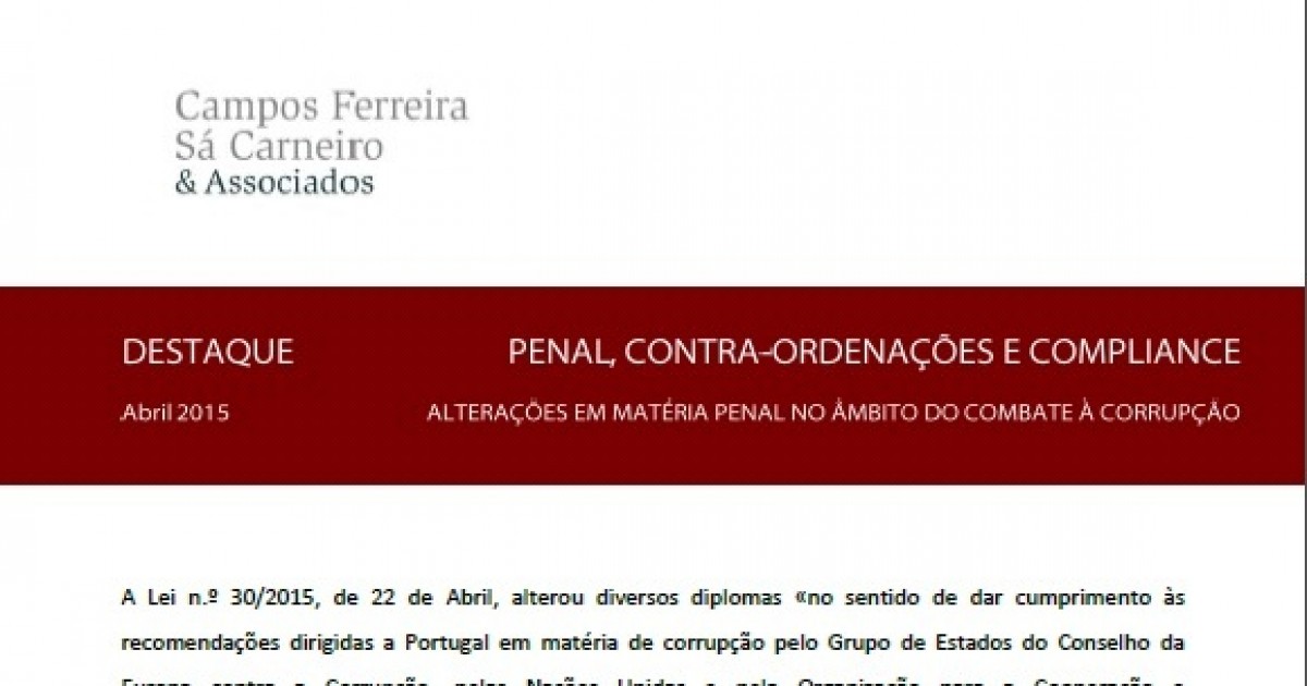 A Lei n.º 30/2015, de 22 de Abril, alterou diversos diplomas «no sentido de dar cumprimento às recomendações dirigidas a Portugal em matéria de corrupção pelo Grupo de Estados do Conselho da Europa contra a Corrupção, pelas Nações Unidas e pela Organização para a Cooperação e Desenvolvimento Económico». Enunciam-se, numa leitura preliminar, algumas alterações.
